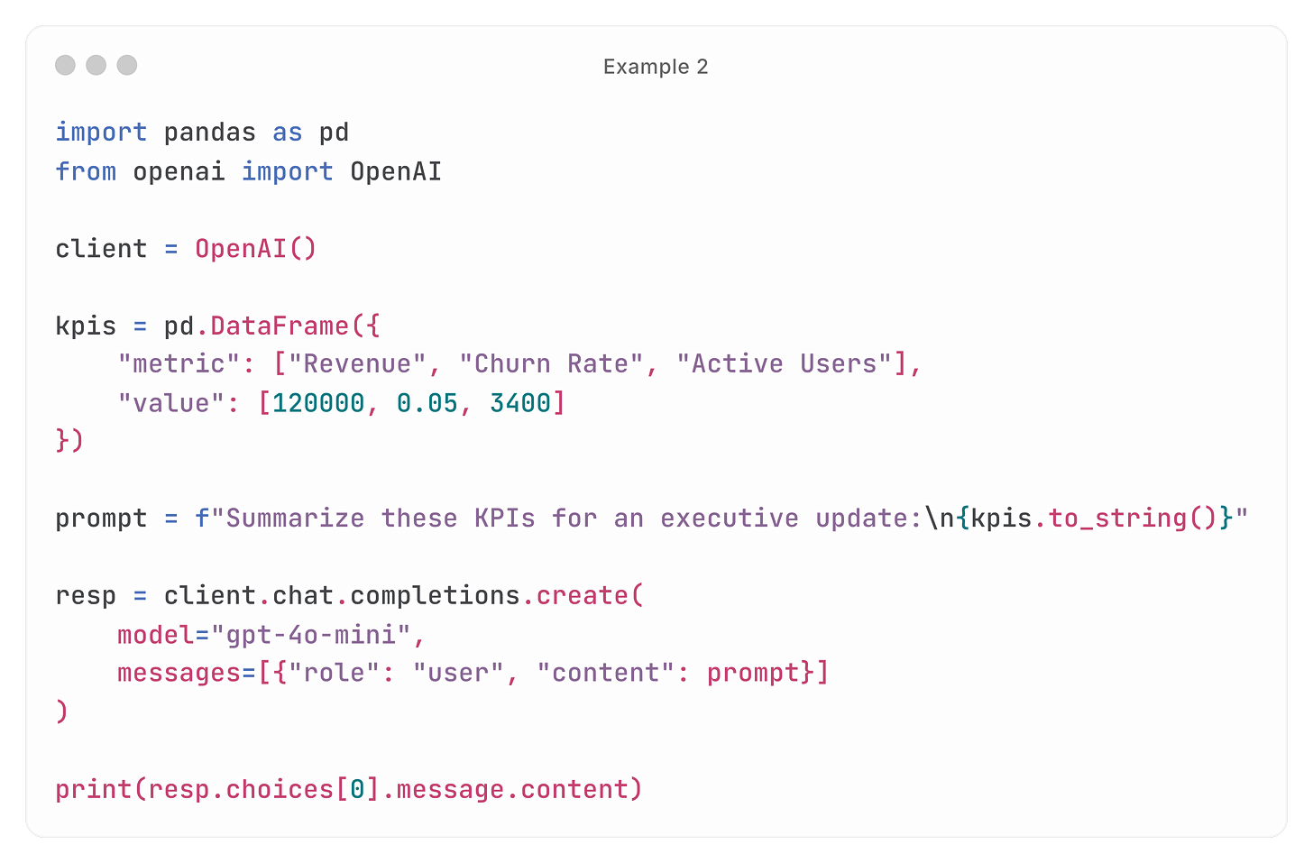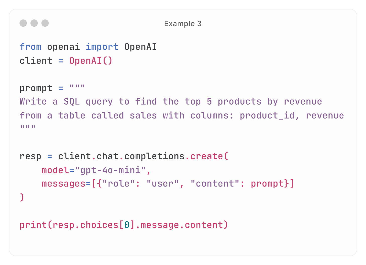 From there, make small adjustments. Maybe you tweak the prompt, or add a post-processing step in Python, or expand it to cover more inputs⦠the world is your oyster!